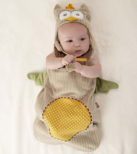 - Enchanting, owl-inspired snuggle sack and cap with plush, ribbed fabric outside and comfy-cozy 100%