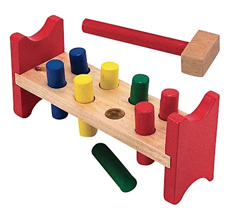 Pound the eight colorful wooden pegs into the wooden bench, then flip it over to repeat the activity again and again! Four pairs of pegs for color matching and wooden hammer included.