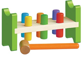 Pound- A - Peg - This Classic Toy will provide hours of stimulus play. hammer colorful wooden pegs until they push through the other side. The pegs fit firm within the bench they can't fall out but can be removed if desired , the bench has a rubber gasket within each peg hole.The bench is packaged in a colorful cardboard tray & shrink wrapped.