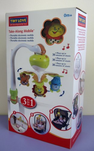 Colorful on the go mobile minutes of musical play easily fits into bag for on the go Can fit most pack n plays car seats strollers and bassinetsThe TINY LOVE Take Along Mobile is a fun, colorful mobile that can travel everywhere you and your baby go. Featuring five soothing melodies and fun colors to keep your baby relaxed and entertained, the engaging mobile secures with a simple snap to most pack-and-plays, car seats, and strollers. Parents and children will enjoy the sense of familiarity the Take Along Mobile brings.