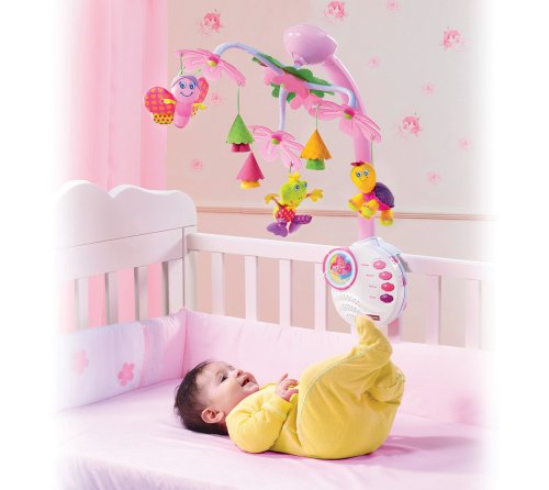 Part of Tiny Princess Collection. Innovative movement develops eye coordination. Converts to crib side music box and night light. Four types of music for 20 minutes of continuous play.