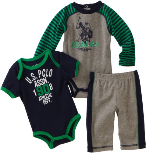 This garment is a three piece set, long sleeve creeper with contrast color sleeves, one short sleeve creeper with contrast color trim,the pant has a leg stripe More info ...