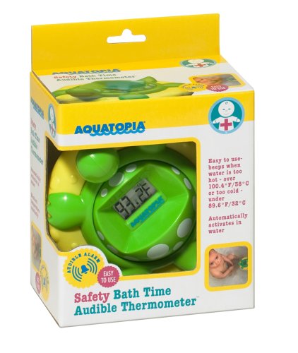 Make bath time safe time! The easy to use Safety Bath Time Audible Thermometer eliminates hazardous guesswork by constantly and accurately measuring the bath water temperature every 2 seconds. It alerts you with an audible alarm if the water is too hot, above 100.4ºF, and another alarm if the water is too cold, below 89.6ºF. Battery powered and water activated, this clever alarm automatically activates when placed in water and de-activates when taken out. Also makes a great bath toy! Fully tested to meet all necessary safety standards.