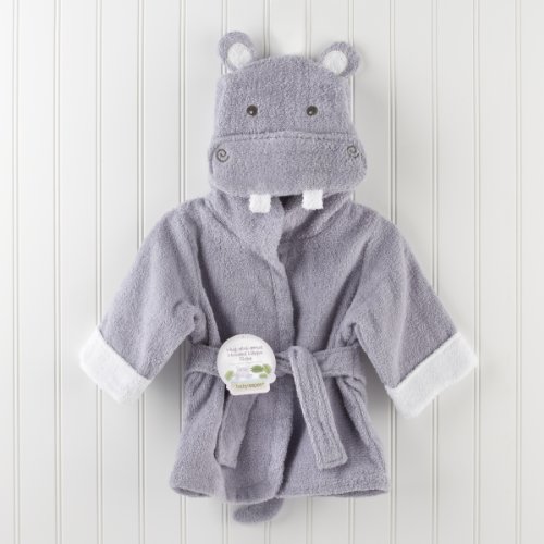 Baby Aspen's "Hug-alot-amus" hooded robe embraces infants with terrycloth coziness and hippo-size cuteness. Features and facts: Lavender terry robe with white cuffs, two terry ties in front, a hood with two smiling, white hippo teeth, appliqued gray eyes and hippo ears. Bottom of robe has a hippo's tail. Sharks can be personalized with baby's inital for an additional cost. Machine-wash and dry (low). Size 0-6 months. More info ...