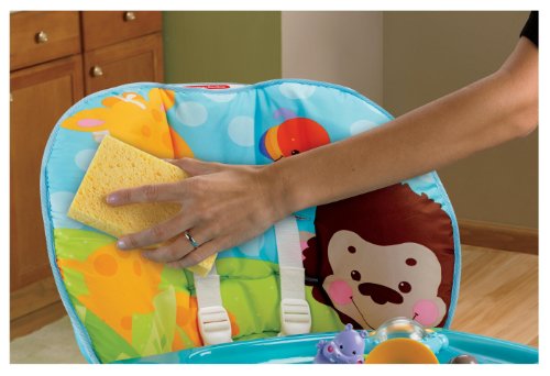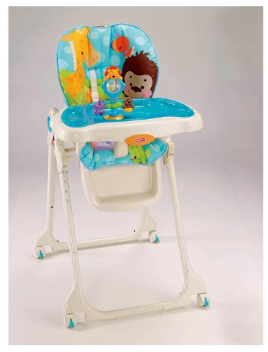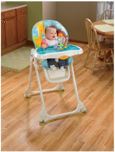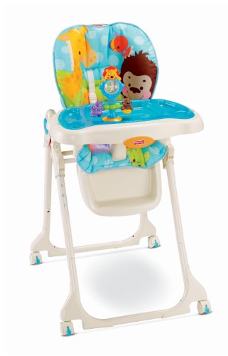 Fisher-Price Precious Planet High ChairMom and Child will love the Precious Planet High Chair with its entertaining tray toy and must have high chair features. This high chair includes a removable suction cup tray toy to entertain baby while mom is working in the kitchen. The chair features 7 seat height adjustments, 3 position recline,1 hand removable tray, translucent blue dishwasher safe insert tray, wipeable/washable pad, 4 lockable casters, and folding legs for storage. More info ...