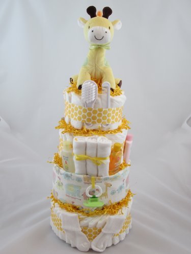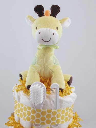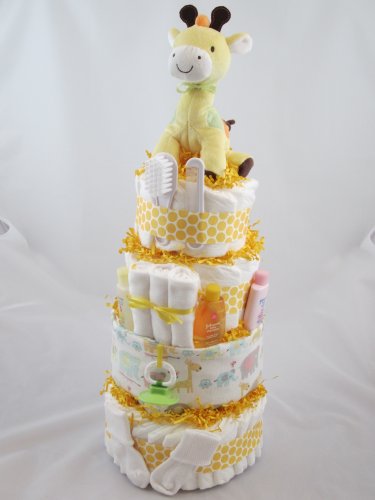 What a cutie!. You'll love of Geri The Giraffe Diaper Cake. This 4 tiered, fan styled diaper cake will be the talk of the party. This gift is packed with useful and practical items you'll need for a newborn. Will make an adorable centerpiece or a welcome home gift for a little girl or little boy.