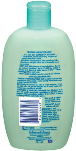 Comfort when your baby has a coldWhen her button nose becomes a stuffy nose, there's Johnson's Soothing Vapor Baby Bath. It's enriched with rosemary, eucalyptus, and menthol-ingredients known for their aromatherapy benefits. In a warm bath, this gentle cleanser provides comfort for your baby. More info ...