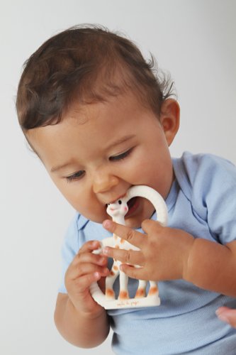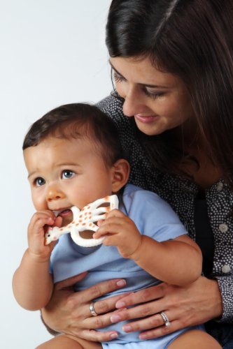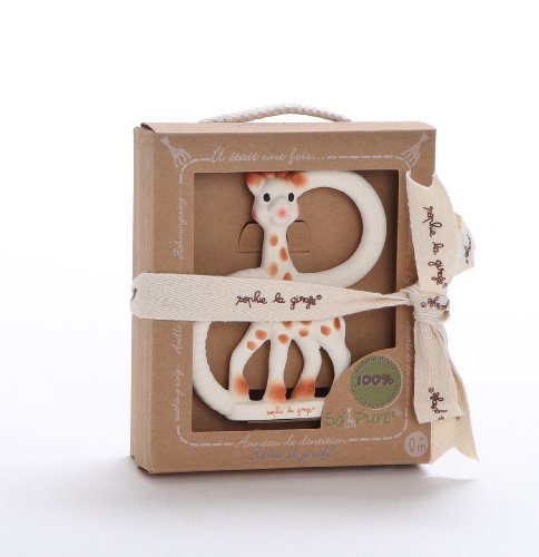 So Pure Vanilla Teether is made of 100% natural rubber. It is BPA, PVC & phthalates free. It is ideal for soothing painful gums. A safe and natural teether providing comfort and relief during teething. The two rings have different textured surfaces for baby to choose from according to his or her age and needs: 1) ridged surface for erupting teeth, and 2) raised bump surface for soothing sore gums. Lightweight two-ring design, easy for small hands to hold and play with. A great on the go companion to the original Sophie the Giraffe. Appropriate for newborns. * Made of natural rubber * Light and easy to grab * BPA, Phthalates Free * Made in France (French Alps) More info ...